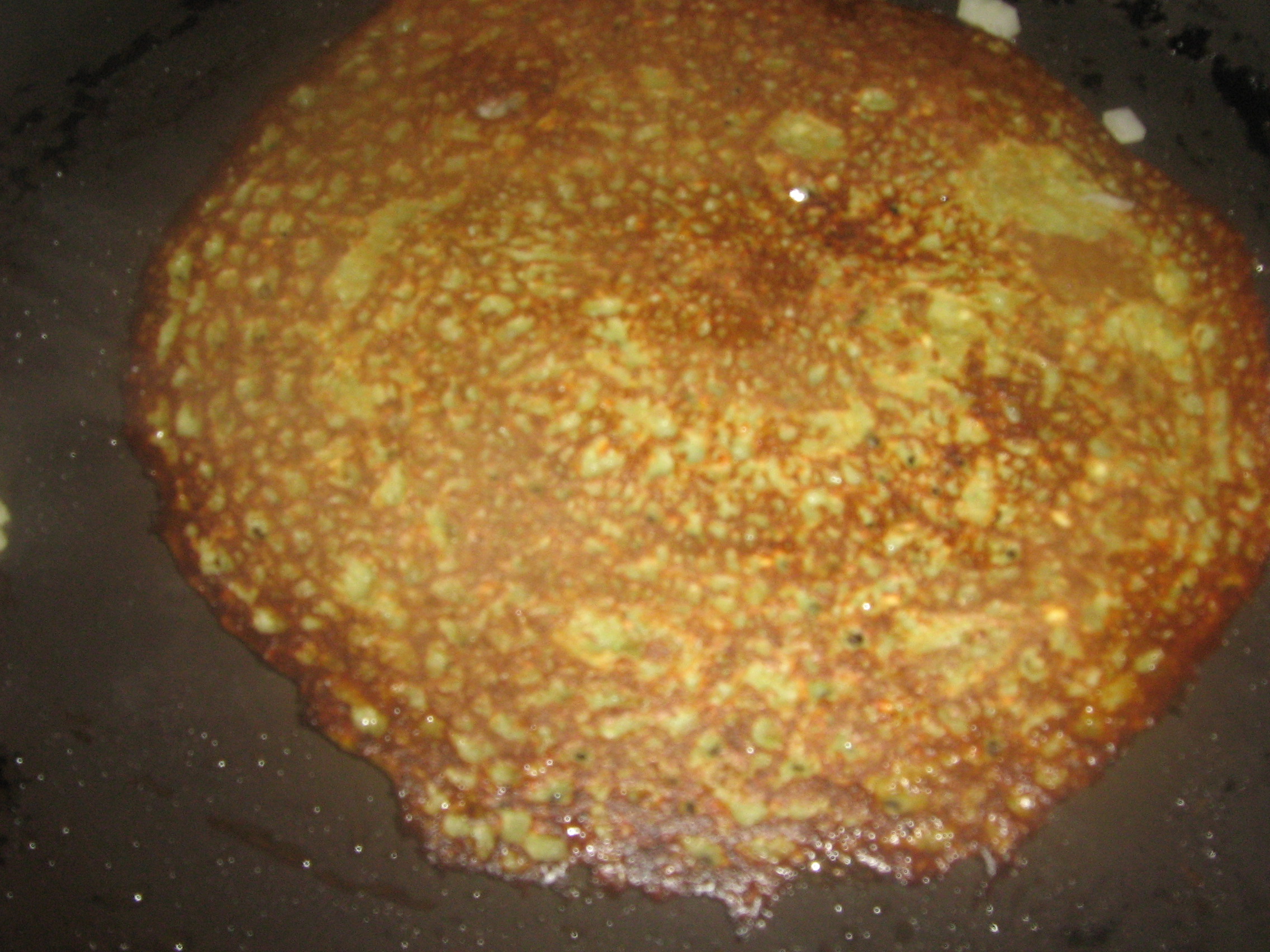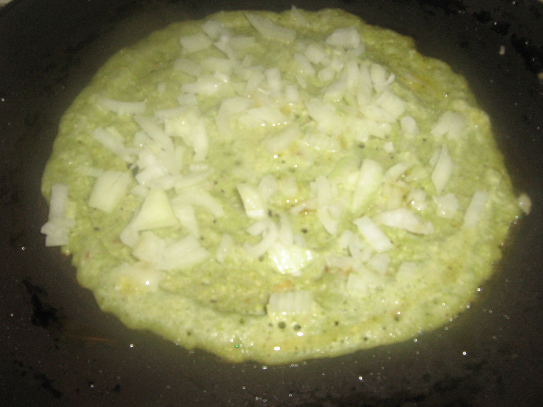 - Heat pan and make pesarattu as shown add chopped onions to it.