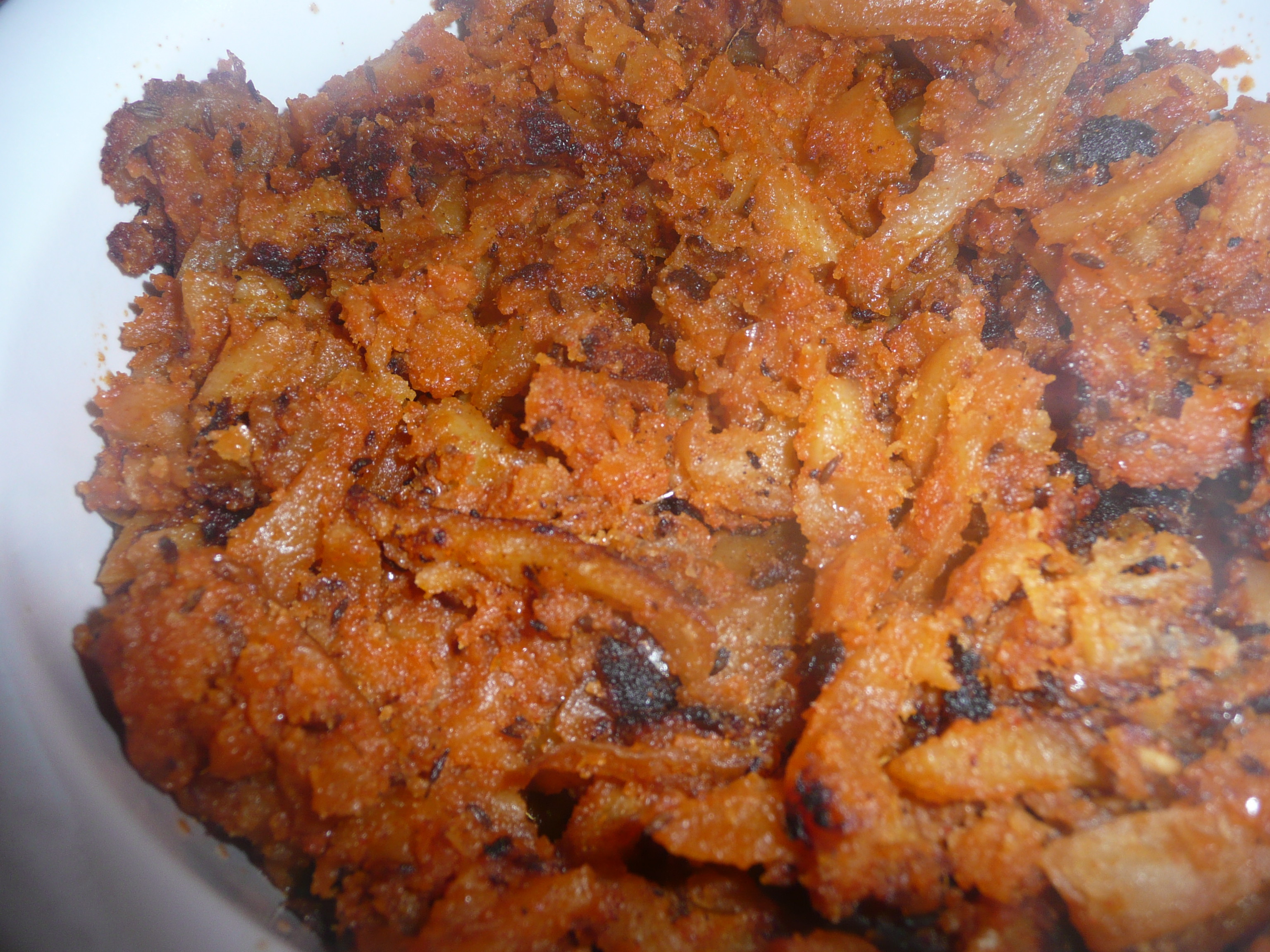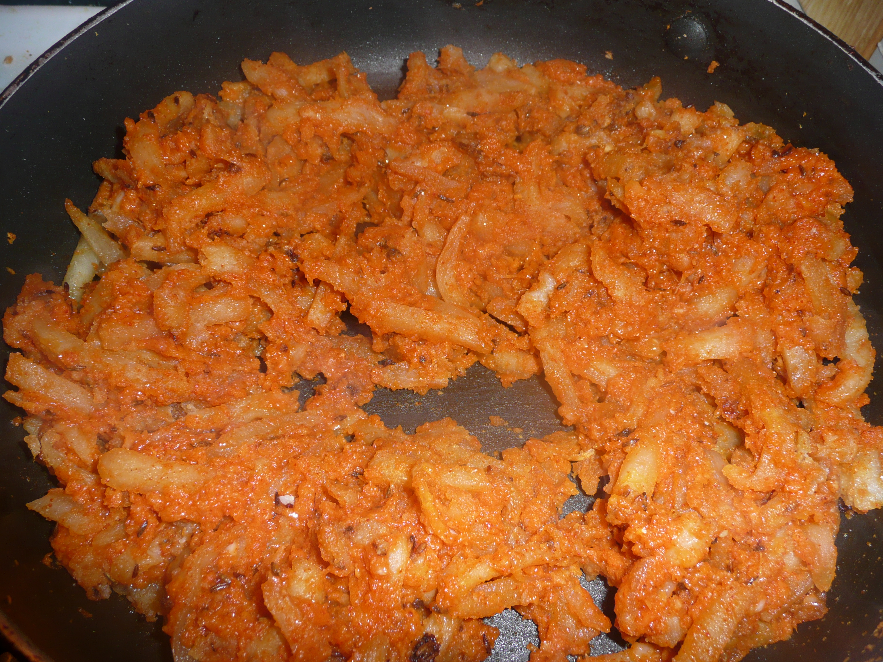- Grind onions with salt and redchilli powder and make a paste of it.