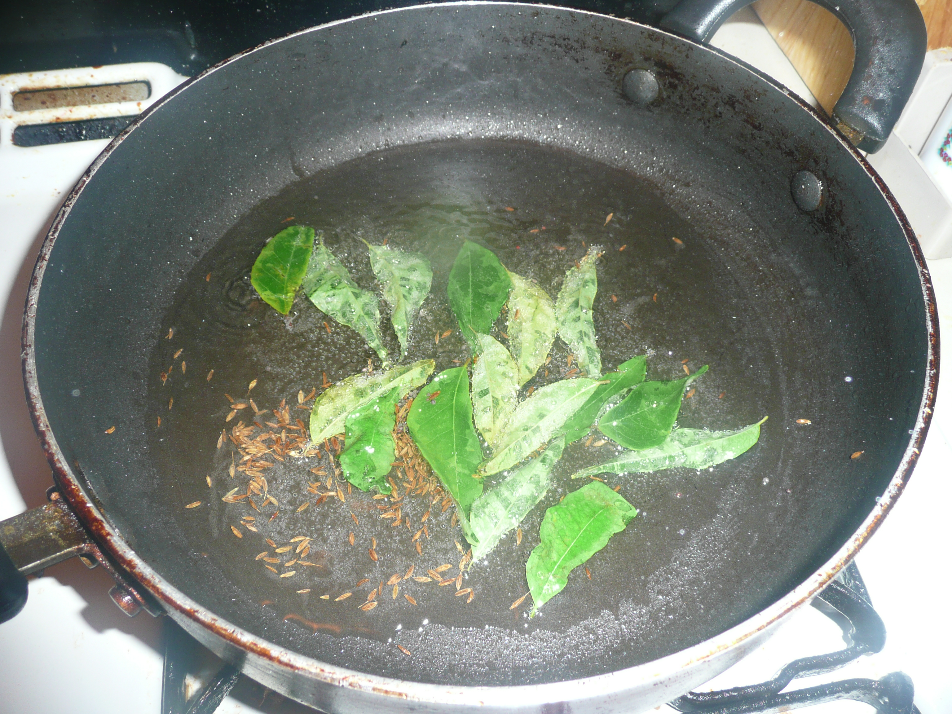 - HEAT OIL AND ADD CUMIN AND CURRY LEAVES TO IT.