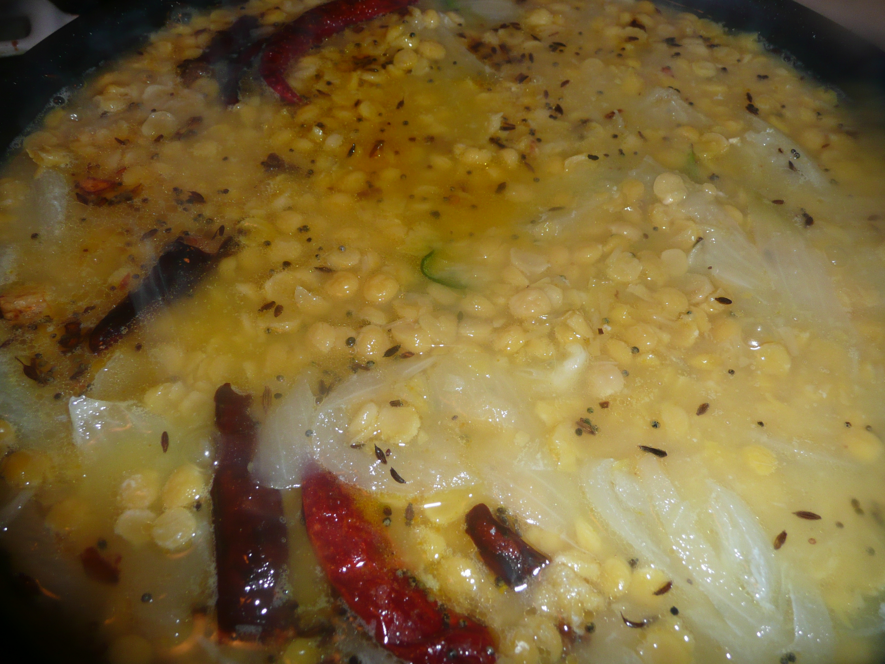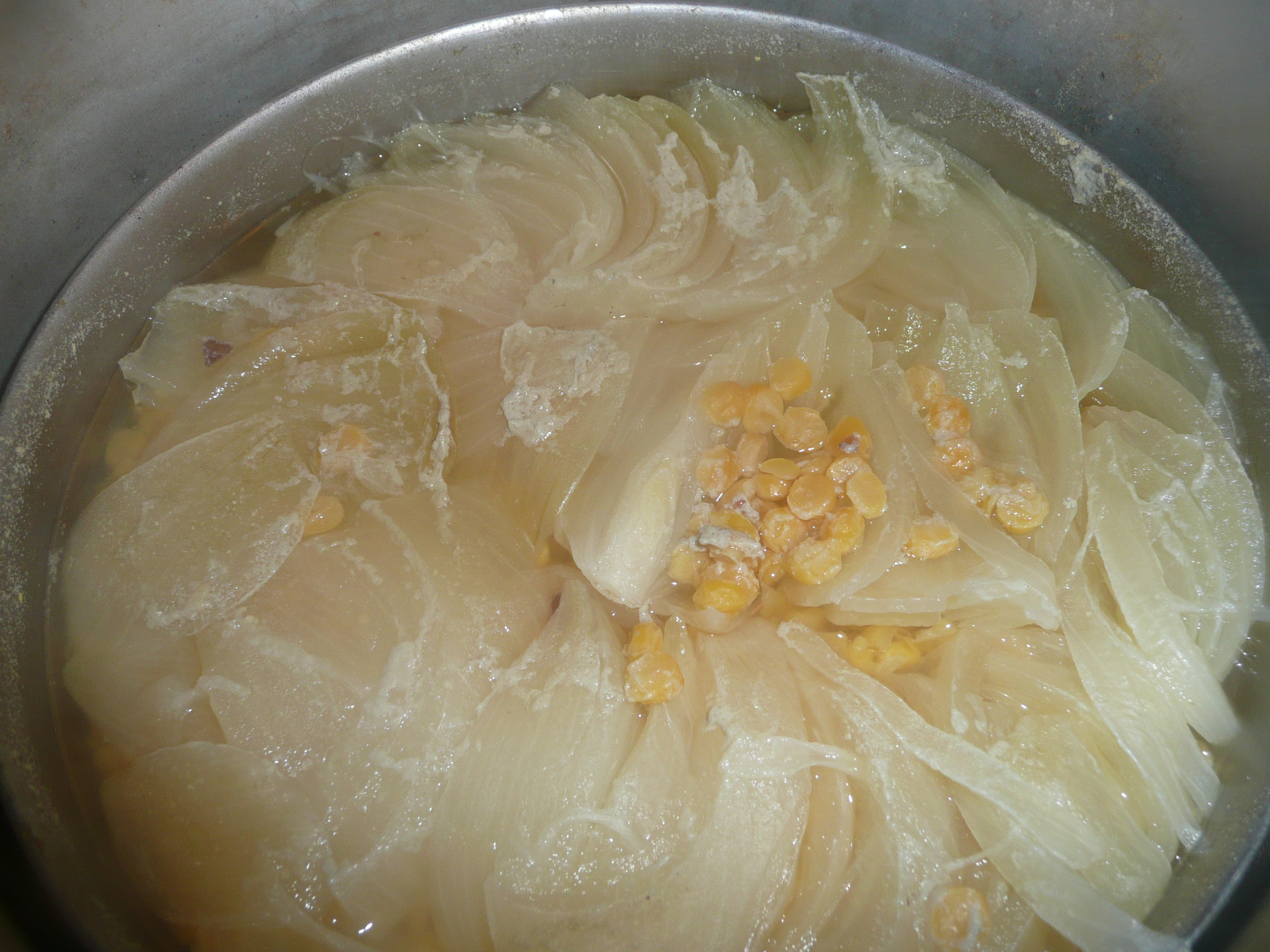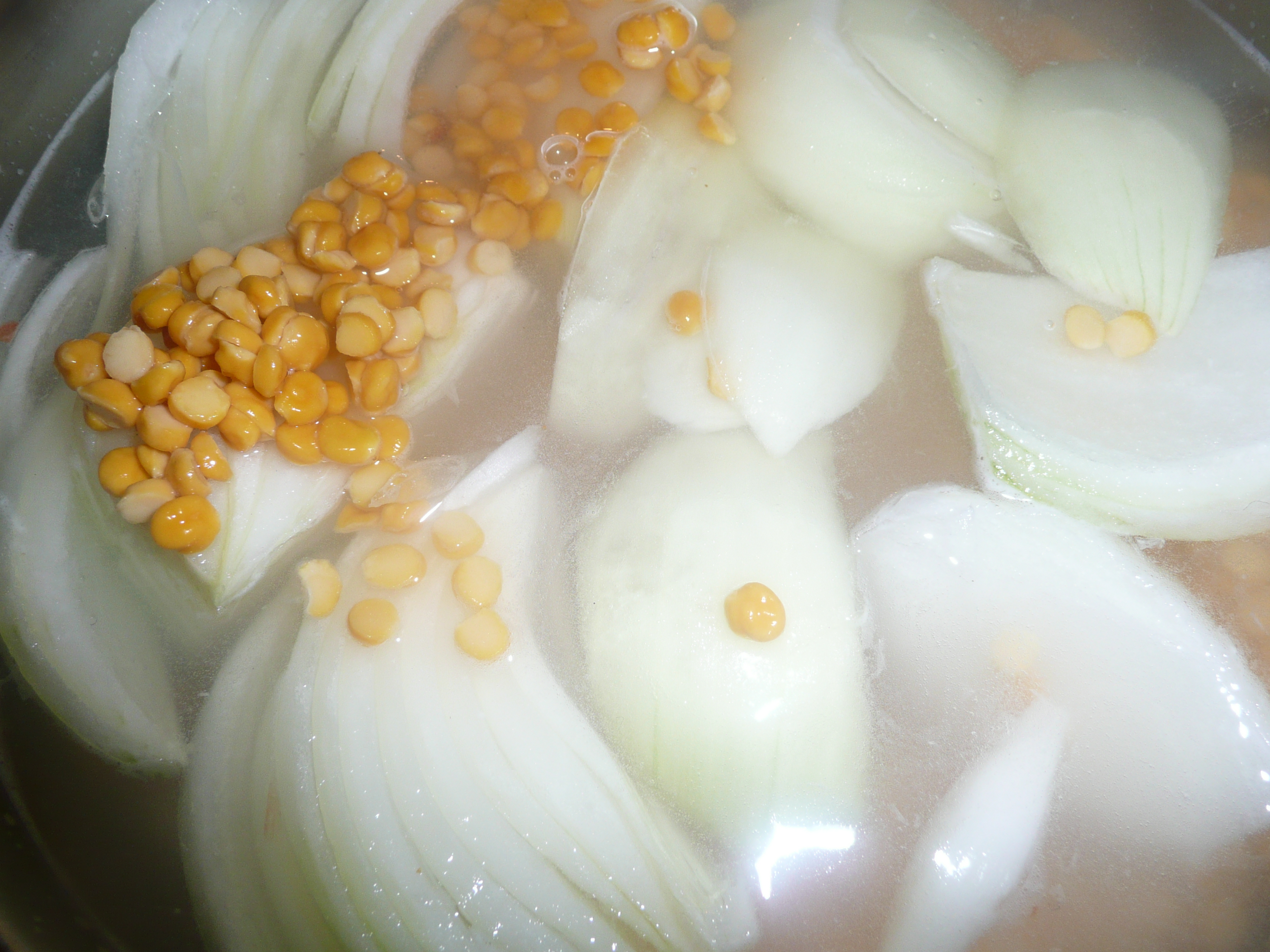 WASH AND PRESSURE COOK DAL AND SLICED ONION FOR 2 WHISTLES.
