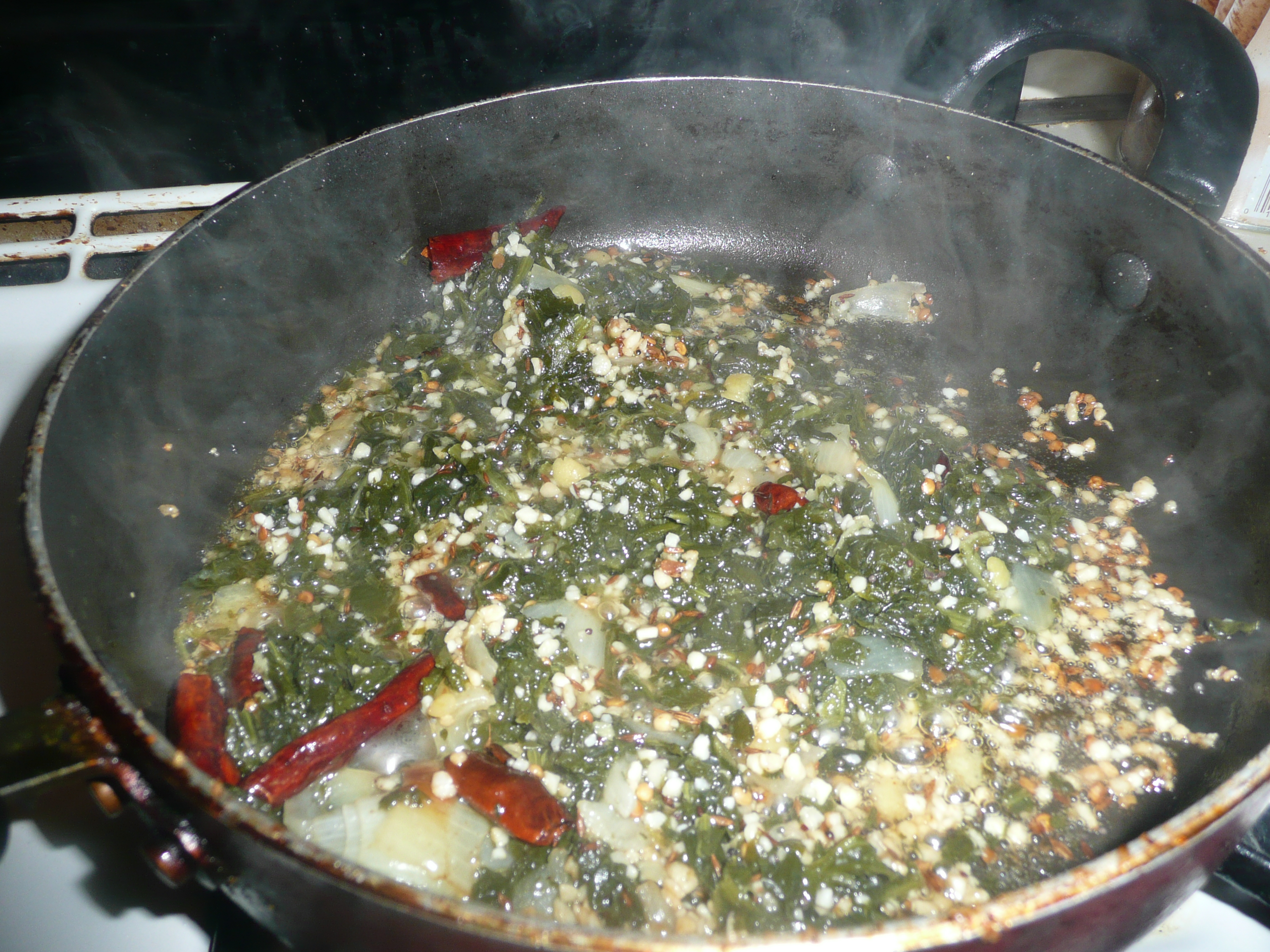 - HEAT OIL IN A PAN AND PUT TADKA AND ADD MINCED GARLIC TO IT.