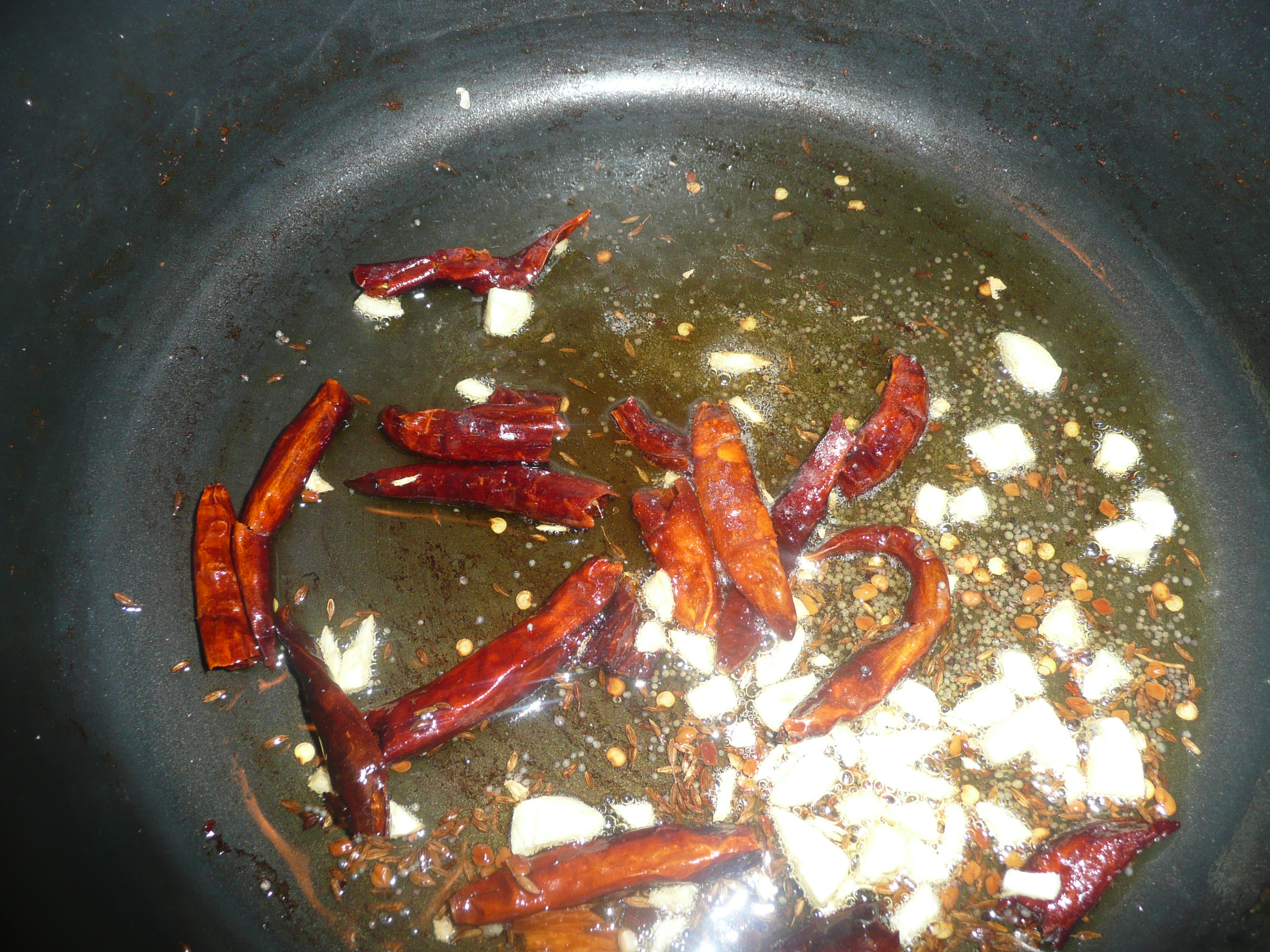 - Heat a pan and put tadka and add chopped garlic to the tadka .