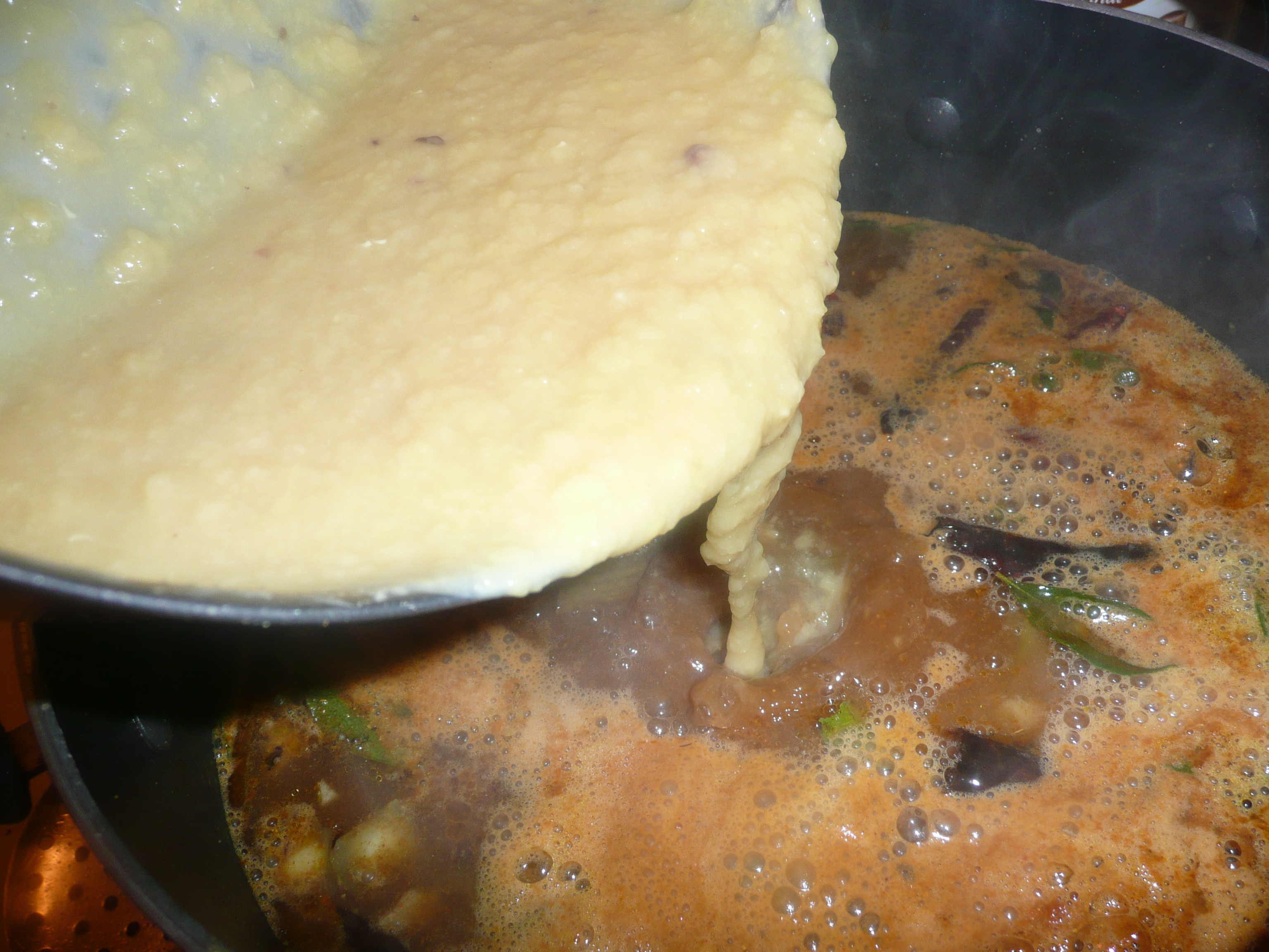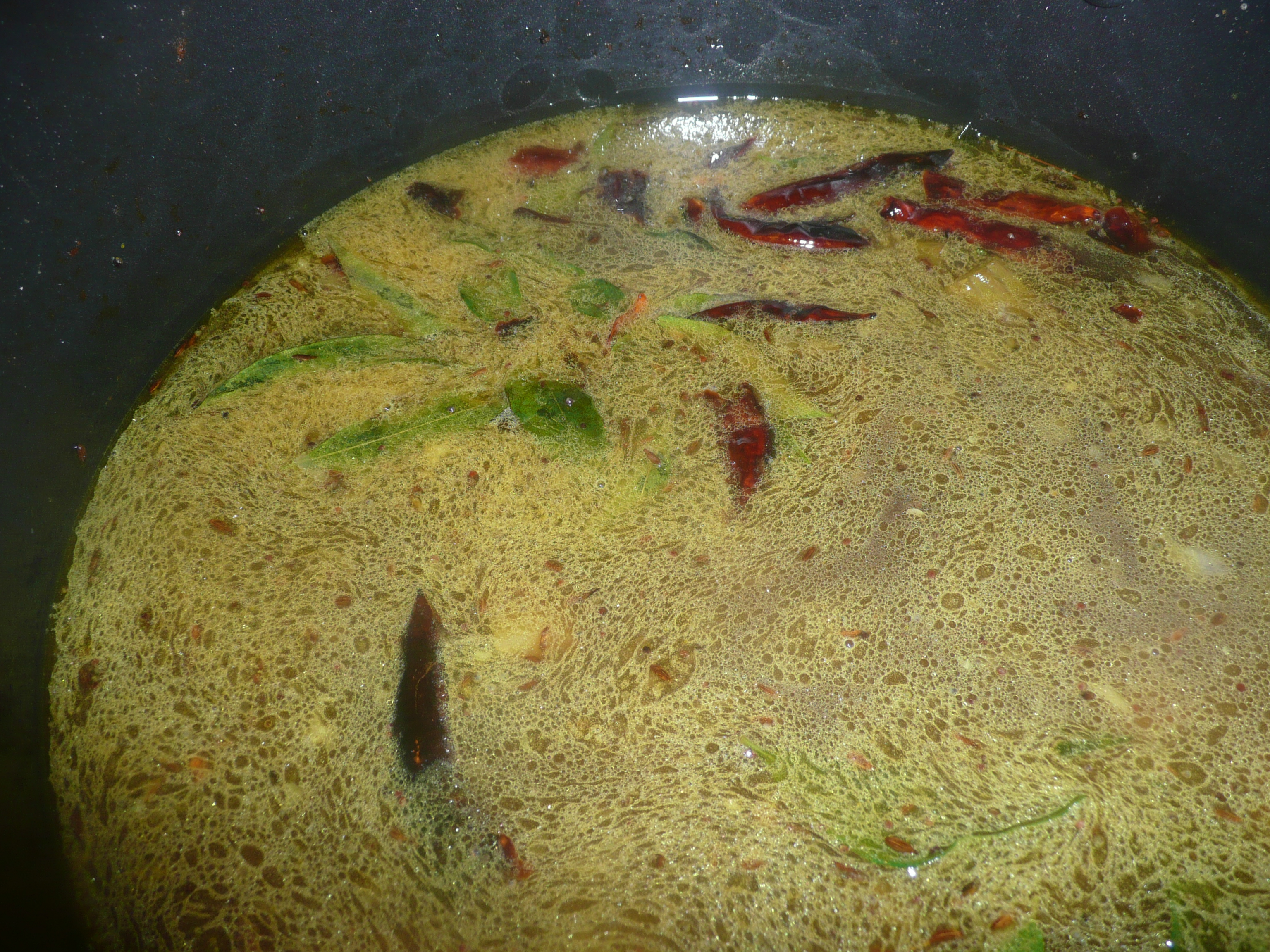 - Add curry leaves ,turmeric , salt and sambar powder and bring it to boil.