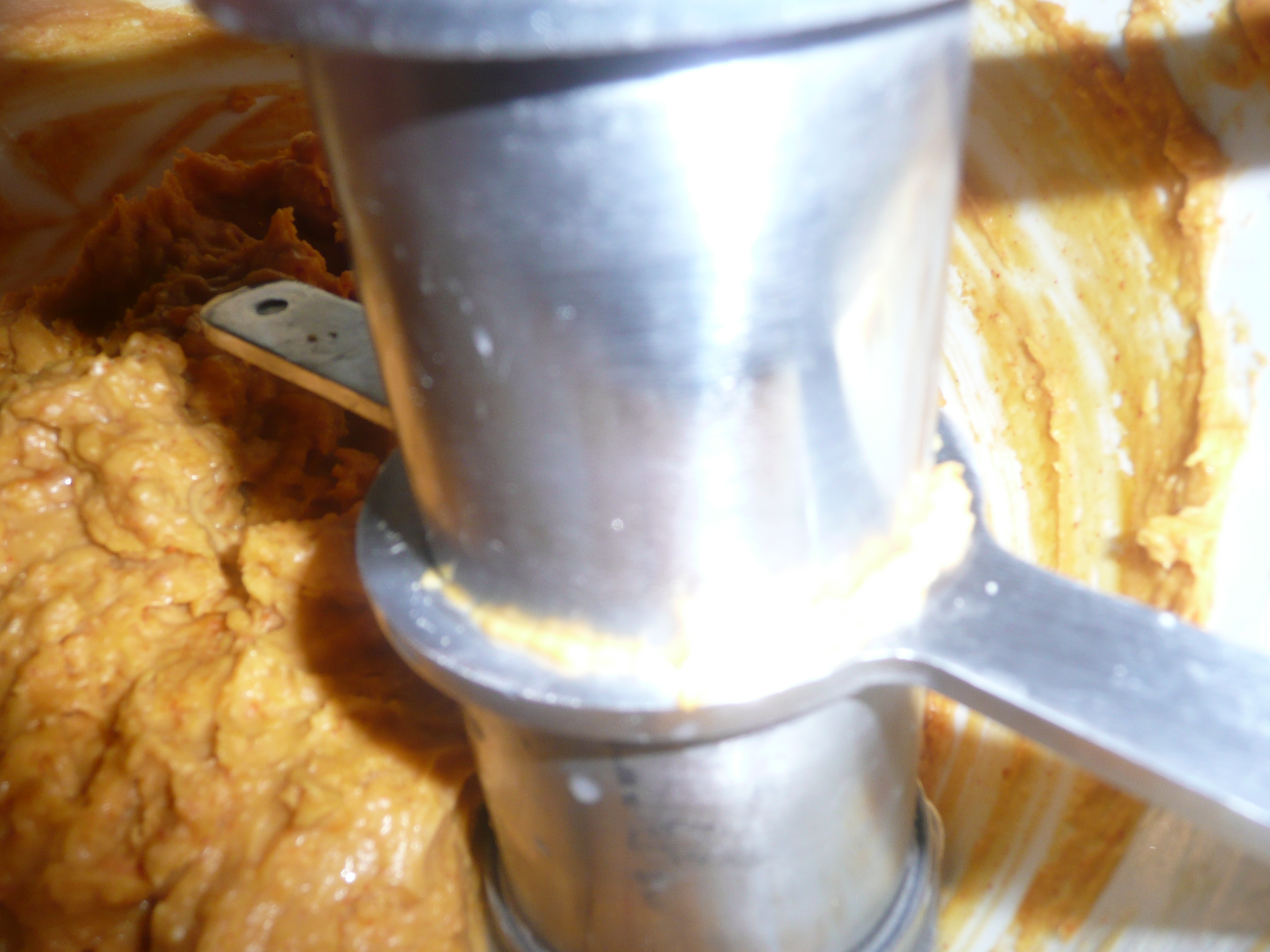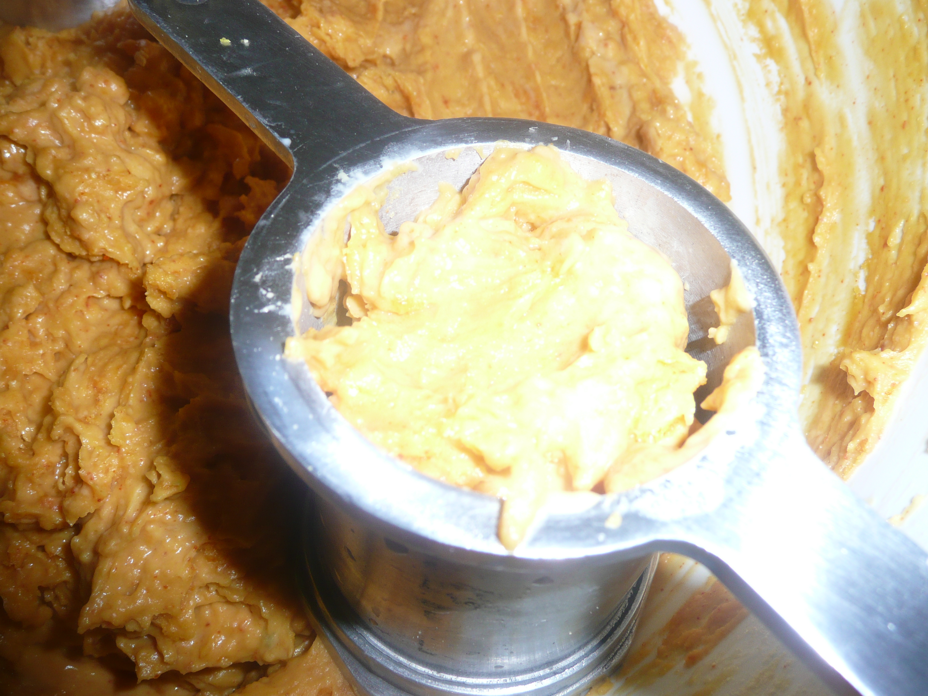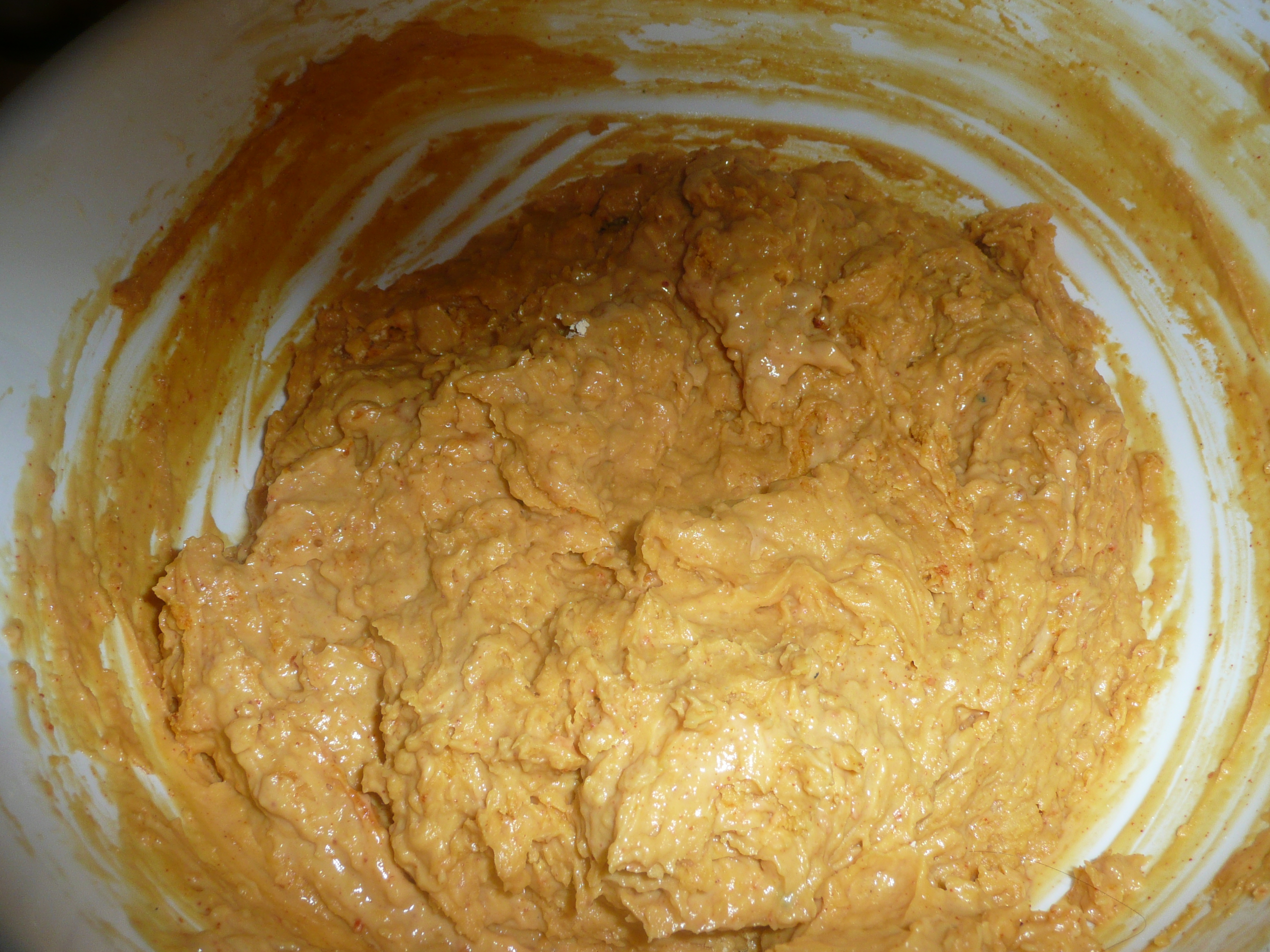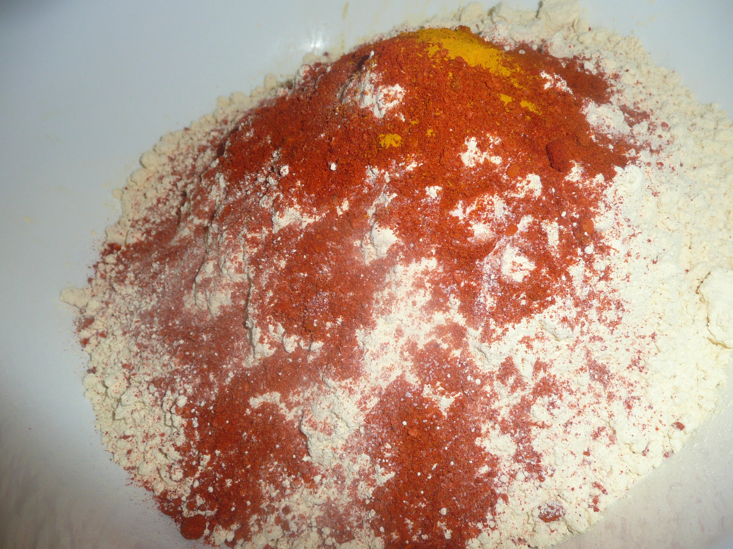 - Mix besan , redchillipowder , turmeric and salt , add water and make a dough as shown .