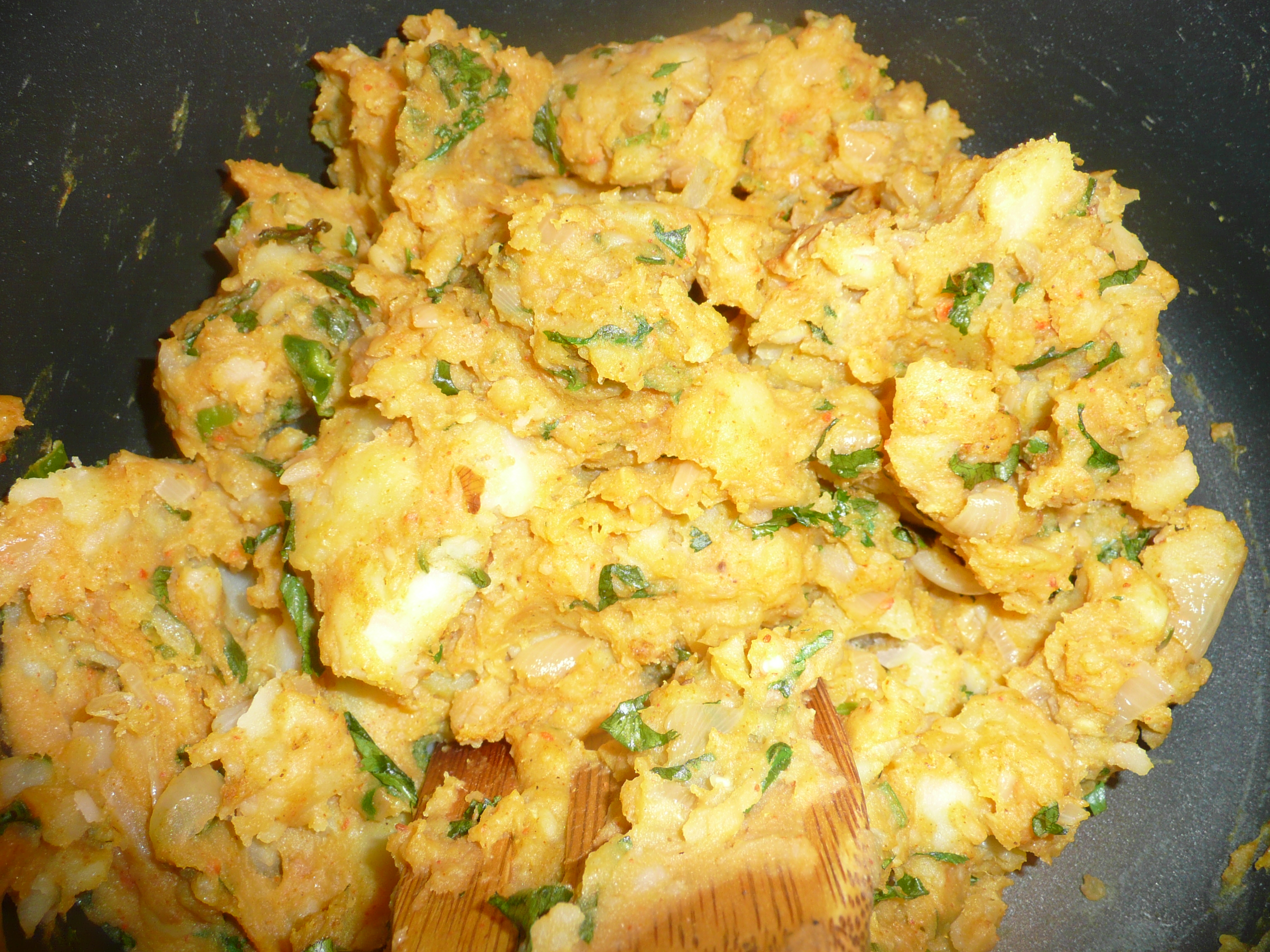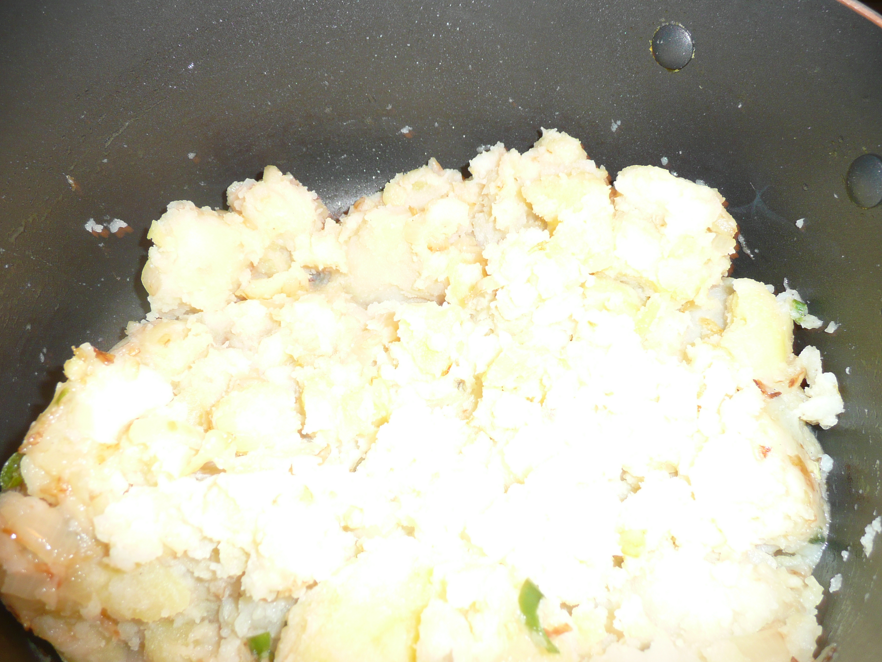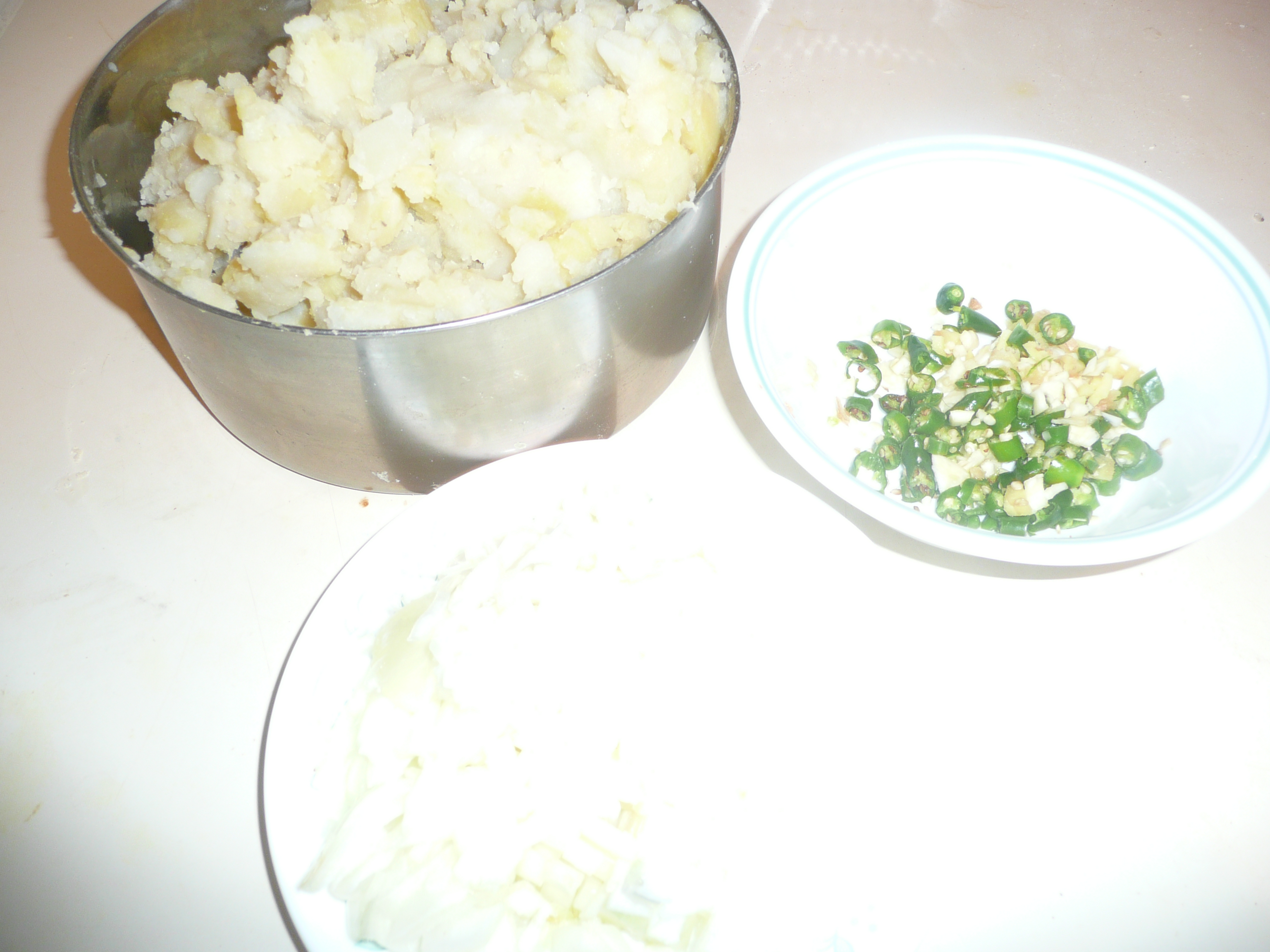 - Chop onions and green chillies .Once the potatoes become cool , peel them off and mash them well.