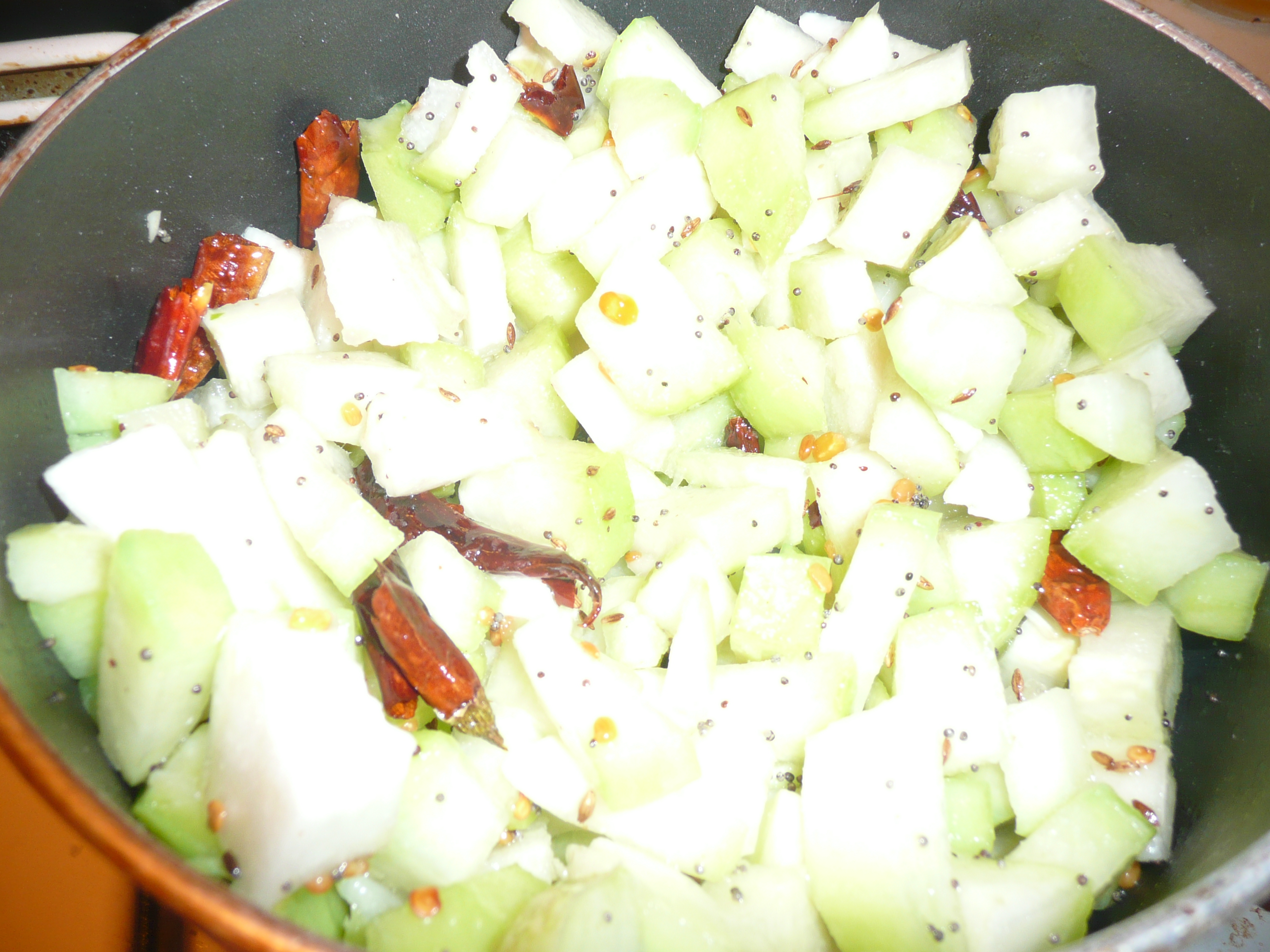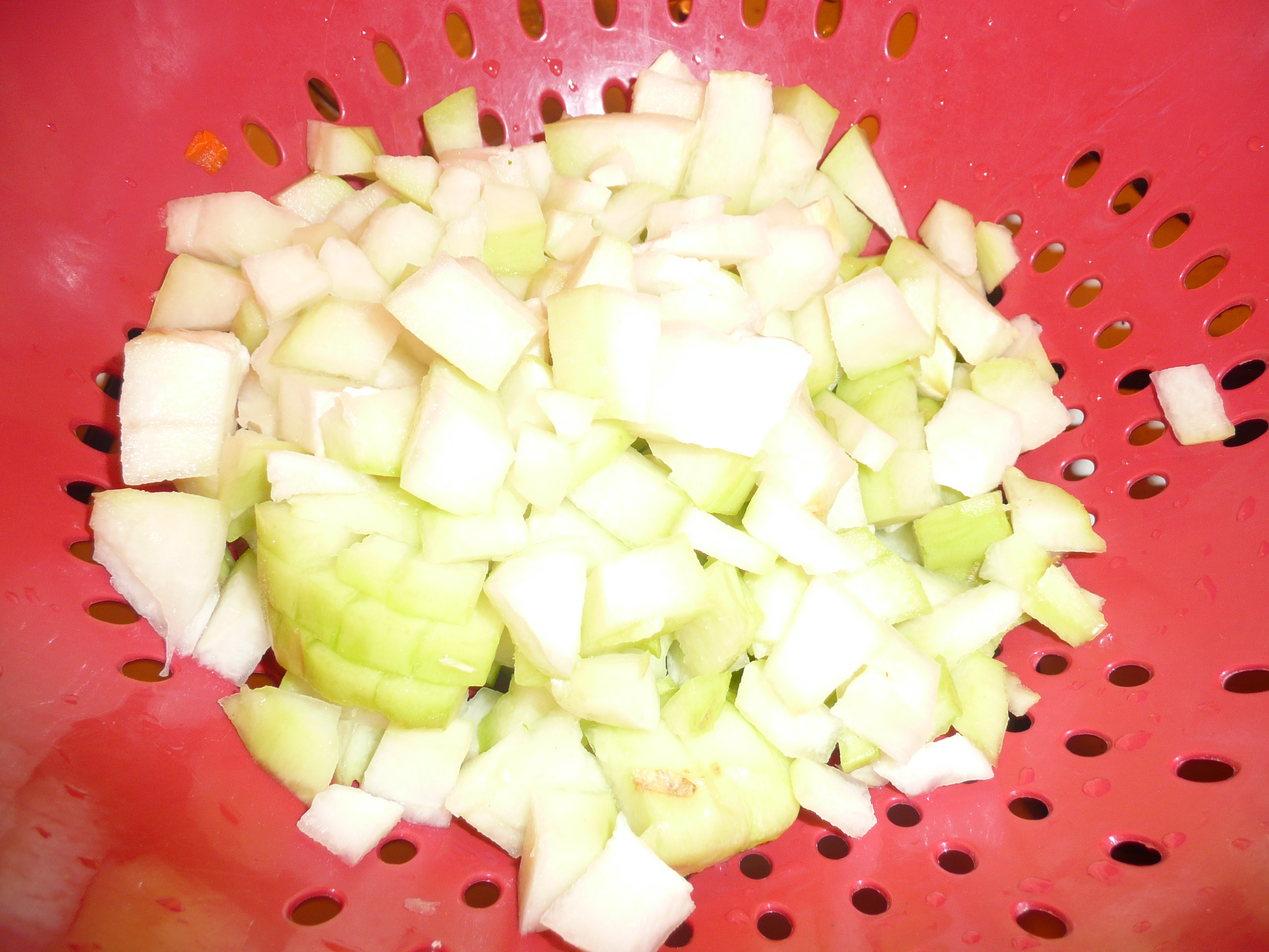 - Wash and peel off the skin of the vankai /chaute kai and chop it to small pieces.