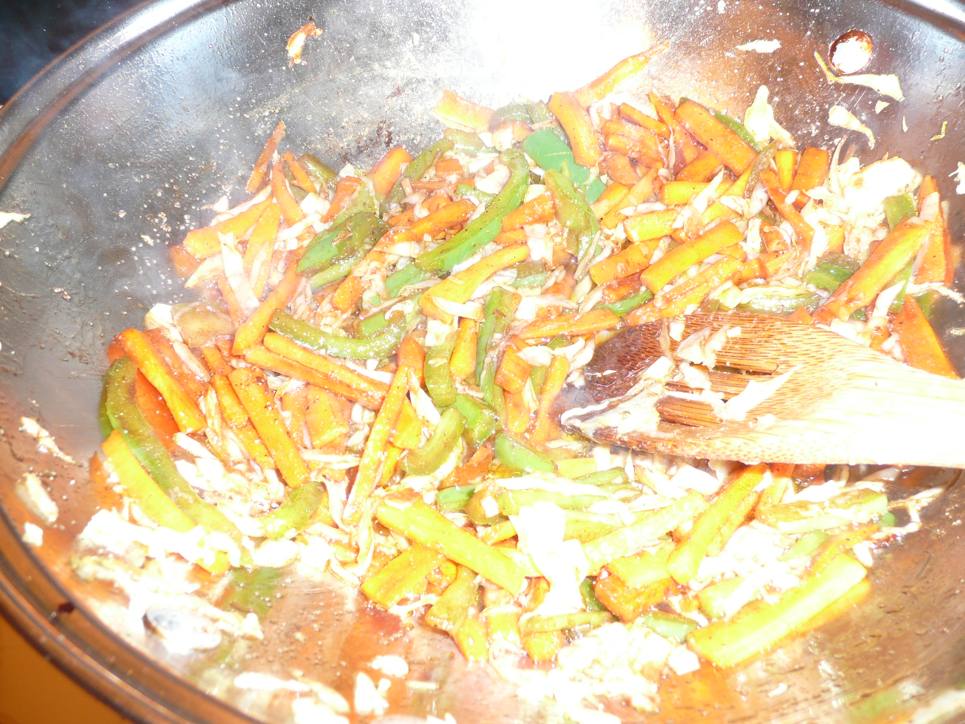 - To the hot oil , add the chopped vegetables and stir fry for 5 min.