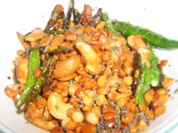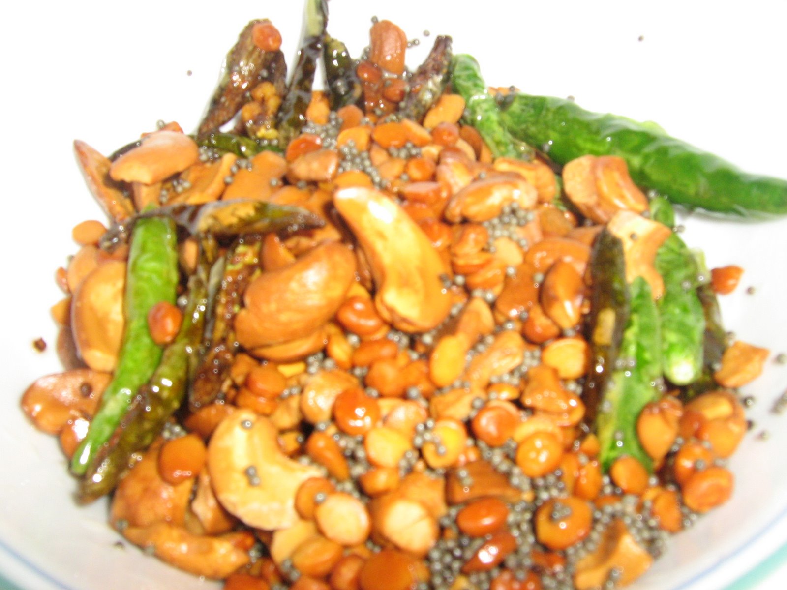 Wash and cut brinjal length wise into slices. Heat oil and add mustard seeds once they sizzle , add cashews, chana dal and greenchillies fry to golden red and set aside.