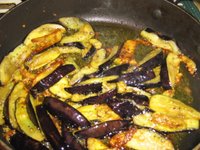 Fry the brinjal slices to golden red in the remaining oil. Now add salt , turmeric and rice to it.
