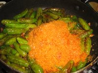 Add redchillipowder , 1tbsp salt and 1 garlic pod as a whole to the dry grated coconut powder and grind it once in a grinder. Add the powder to the dondakai and mix well. Cook for 5 min on low flame and remove from the flame.