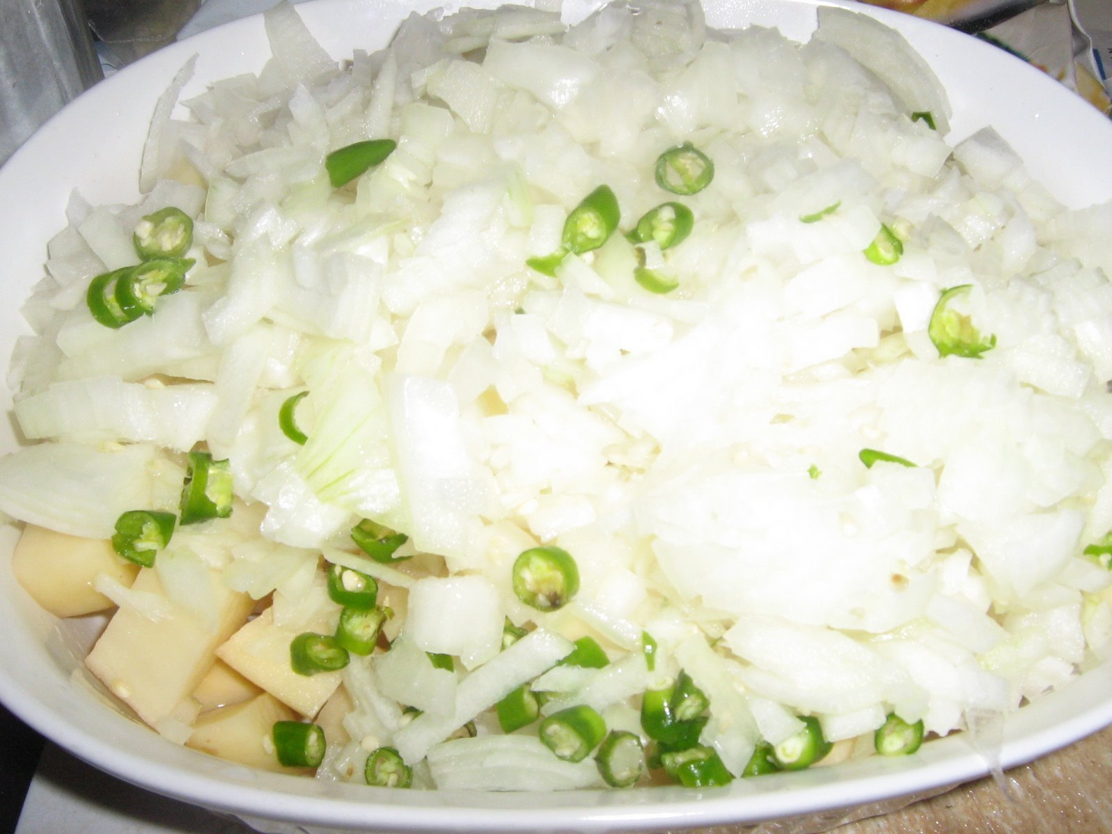Peel off potatoes and cut them into medium sized pieces . Chop onions and greenchillies and microwave cook them for 10 min.