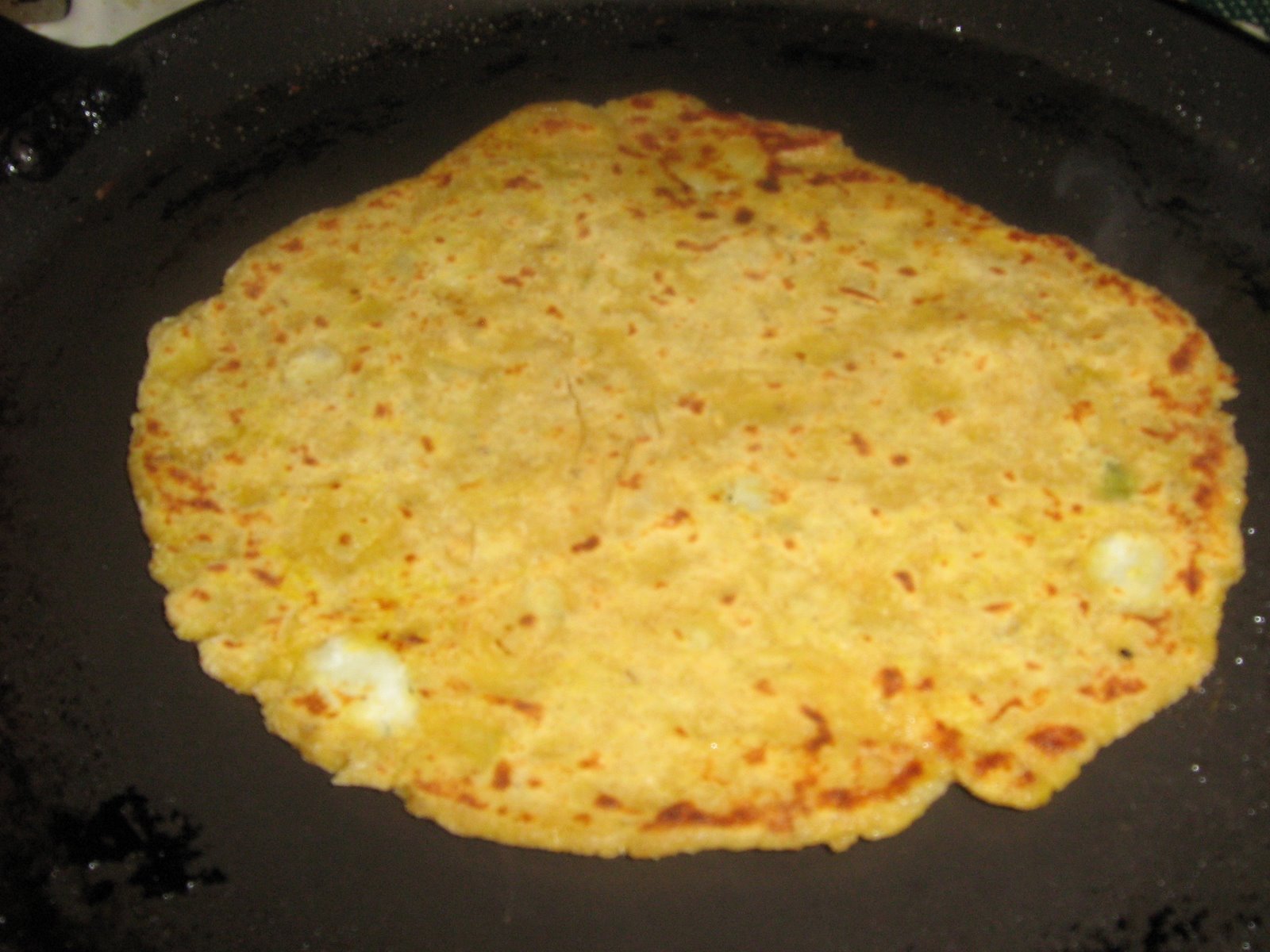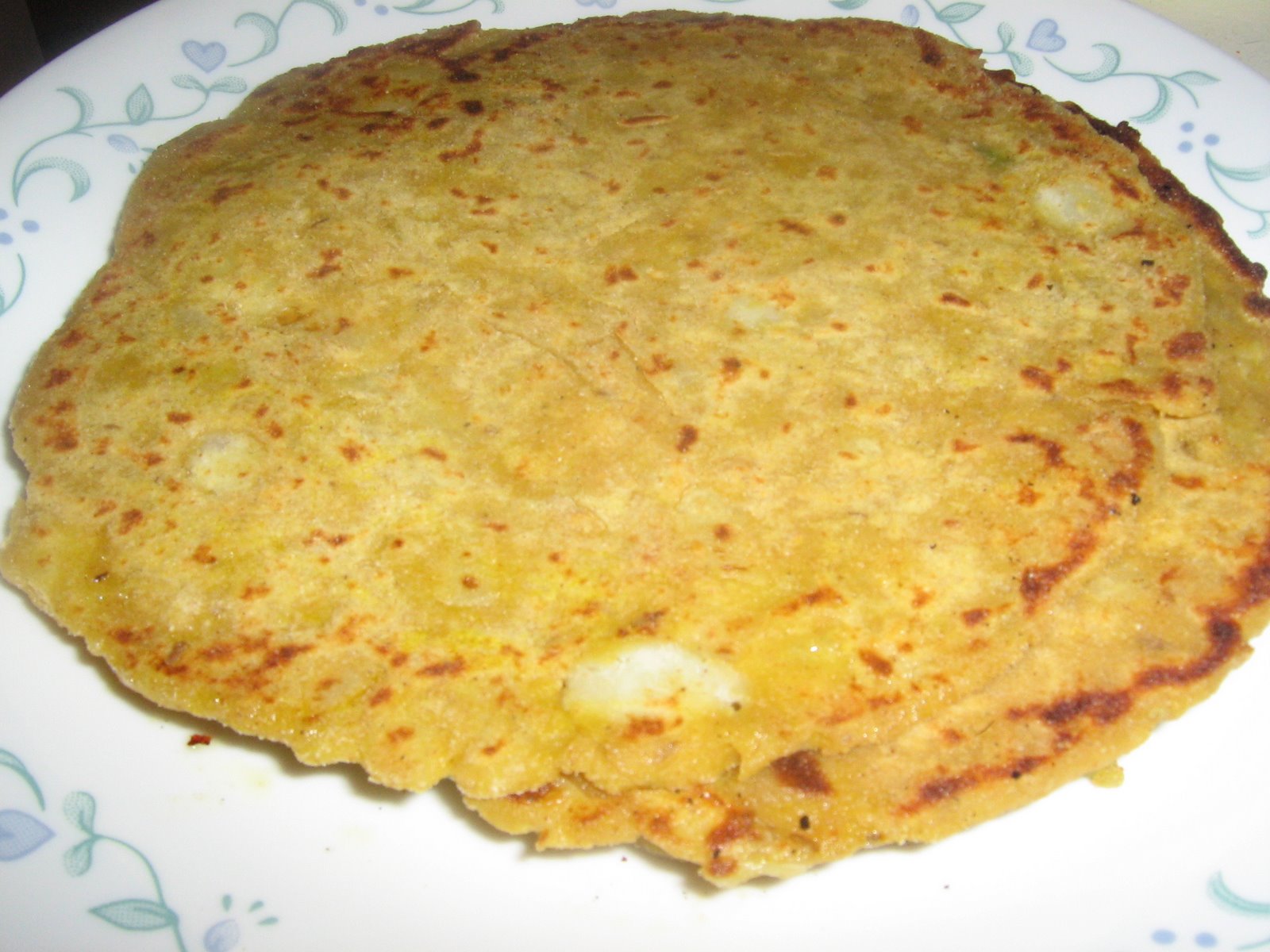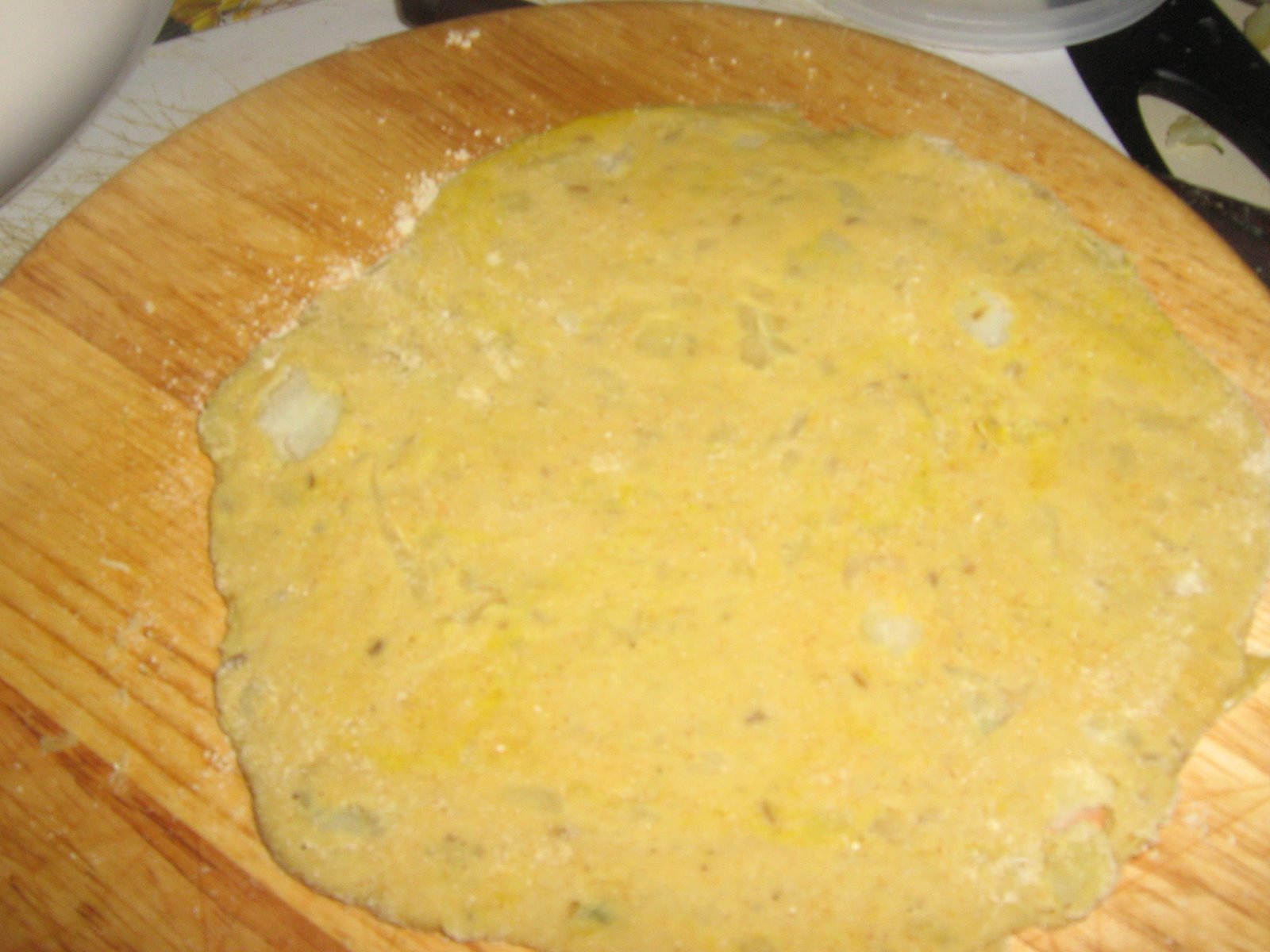 Then mix the wheat flour , besan to the smashed potato mix and prepare a dough of it. Make small balls and roll them into rotis. Now heat a pan and fry on both sides applying oil on both sides.