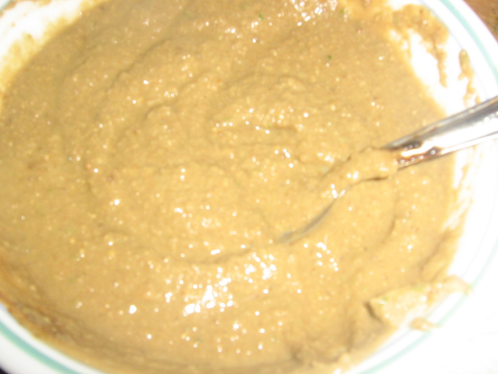 Set this paste aside and prepare dough semi solid state by adding besan , cooking soda ,11/2 tbsp of salt , redchilli powder and 1/2 tsp of vamu or ajwain . Check for consistency of the dough . You should be able to dip the mirchi in it and leave it in oil.Heat oil parallely , stuff the mirchi’s with the roasted chana dal paste .