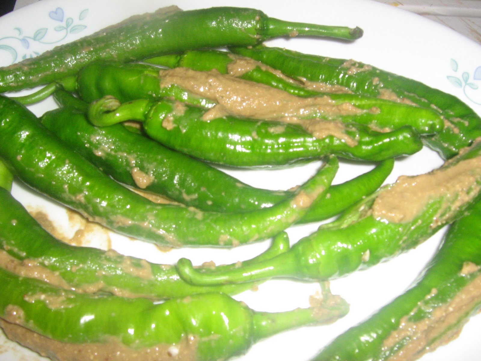 Wash chillies and cut the center of it along the length inorder to be able to stuff the roasted chana paste.Grind the roasted chana adding 1/2 tsp of ajwain or vamu and 1/2 tsp of salt and greenchillies . Then add tamarind puree and make a fine paste by grinding again.