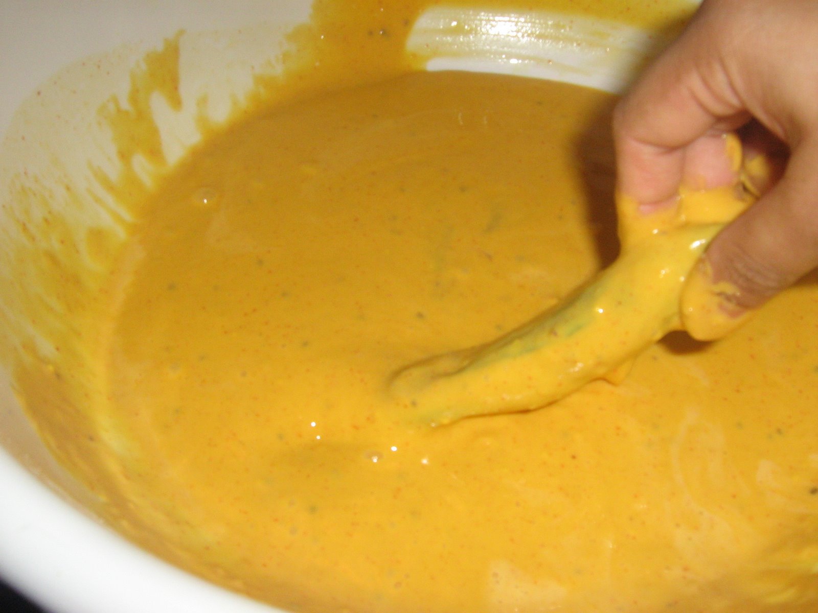 Once the oil is hot , dip the mirchi in the besan dough and leave it carefully in the hot oil.